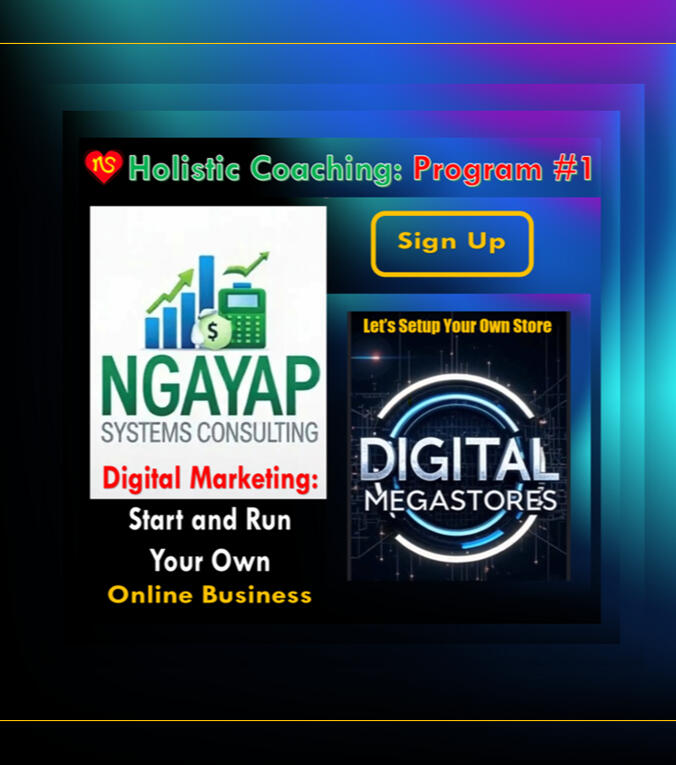 Our 6 Consulting & Coaching ProgramsAt Ngayap Systems Consulting, you can select one or more of our tailored training and coaching solutions geared to empower your professional and personal growth. Explore our six core programs designed to help you thrive:1. Digital Marketing Mastery2. Wellness & Well-being Coaching (Powered by Faforlife)3. Sustainable Development & Environmental Consulting4. Accounting & Business Management Consulting5. Handiwork-to-Business Accelerator6. Authorpreneur Success Program❤️ Your Success Starts Here
